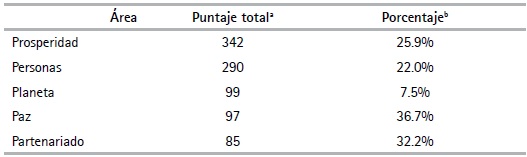 Estas áreas muestran una relación con las cuatro dimensiones de la sostenibilidad. El área personas se asocia con la dimensión social de la sostenibilidad, el área planeta, con la ambiental, la prosperidad, con la económica, y paz y partenariado con la gobernanza.