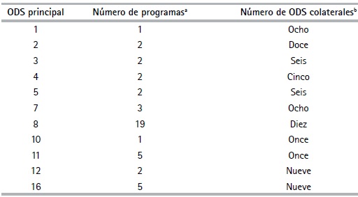 En el segundo paso se calculó el número de asuntos relevantes de los ODS colaterales que se incorporaron en el conjunto de programas enmarcados dentro de cada ODS principal. Un ejemplo puede ayudar a entender este punto: los programas A y C tuvieron como ODS principal el 5, el programa A incorporó dos asuntos del ODS 1, tres del ODS 5 y dos del ODS 8, y el programa C incorporó un asunto del ODS 2, dos del ODS 5 y tres del ODS 8. Así, pues, dos programas se enmarcarían en el ODS principal 5 (A y C), los cuales, en conjunto, habrían incorporado dos asuntos relevantes del ODS 1, cinco del ODS 5 y cinco del ODS 8.