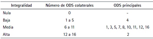 Finalmente, en el tercer paso se clasificó el tipo de interacciones establecidas entre los ODS por medio de los programas con base en dos categorías: integralidad e intensidad. La integralidad es una medida que refleja la diversidad de ODS cuyos asuntos se incluyen dentro de los programas de los ODS principales (entre mayor sea el número de ODS con que se articule un programa, más integral y completo este se considerará). La intensidad, por su parte, es una medida que captura la fuerza de la relación que establecen los programas de un ODS principal con los ODS colaterales (entre mayor sea la intensidad, más estrecha es la interacción que un programa establece con los ODS colaterales, en el sentido de que incorpora un mayor número de sus asuntos). La integralidad y la intensidad se dividen en cuatro escalas ordinales: nula, baja, media o alta, cuyos rangos se exponen más adelante.