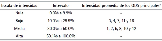 En general, de los once ODS principales, cinco exhiben una intensidad promedia Baja (ODS 3, 4, 7, 11 y 16) y seis, una intensidad promedia media (1, 2, 5, 8, 10 y 12). Ningún ODS principal tiene un grado de intensidad promedio nulo ni alto (véase Cuadro 5). La intensidad promedia se calcula como el promedio simple de las intensidades significativas (es decir, aquellas mayores a 9.9%) que establece un ODS principal con el resto de los ODS.