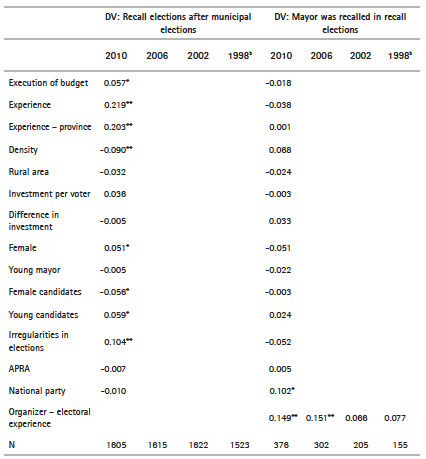 The young candidates variable is not statistically significant in any of the models and the young mayor variable is not statistically significant in the regression models. The gender of mayors and the gender of candidates in municipal elections are not statistically significant variables for explaining why a recall may be initiated. Although there is a positive relationship between a female mayor and the probability of recall elections, this does not reach statistical significance in any of the models and nor does political membership in APRA.