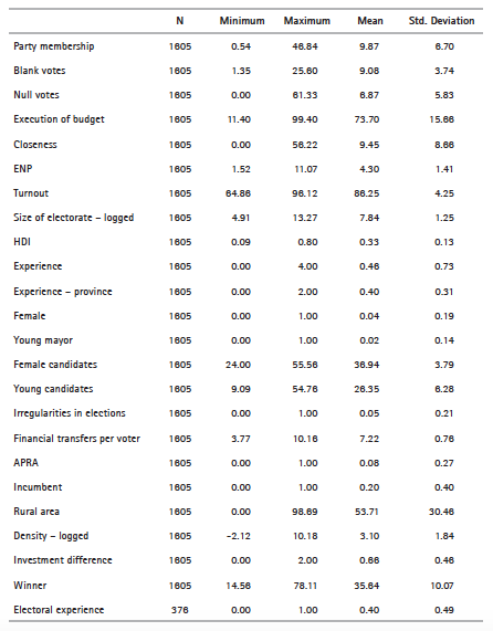 Other control variables include election closeness and the effective number of parties (ENP). Closeness is measured as the percentage difference between the second and the first candidates in the election. The percentage difference is a good measure to be used in the Peruvian context, as the winner always receives more than half the seats in the municipality and the electoral system is heavily disproportionate. I include the ENP mainly because of party coordination. Successful electoral strategic coordination decreases the number of political parties competing in elections (Cox, 1997, p. 4). ENP can measure this and it should be easier to organize and mobilize to initiate recall elections when there are fewer political parties. I use the winner’s percentage of the vote for models that deal only with successfully initiated recall elections. In this case, there was already enough coordination for a successful recall and, because all citizens can vote, the winner’s last percentage in the election is more important. A mayor must receive more than 50 percent of valid votes to be recalled and 25 percent of the signatures of the electorate are enough to initiate a recall.