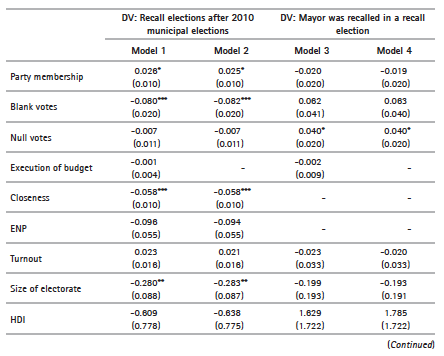 A greater number of null votes increases the likelihood of the successful removal of a mayor. In this case, even though blank votes go in the same positive direction as null votes, this variable does not reach statistical significance. After controlling socioeconomic variables (such as education within the HDI) that could have an influence on an involuntary voter error. It seems that null votes better explain voters’ dissatisfaction in municipalities, which they manifest during recall elections in removing a mayor. As I mentioned in the theory section, most studies do not differentiate between blank and null votes. The results of this study show that there may be good reason to distinguish between these two forms of invalid votes in future research.