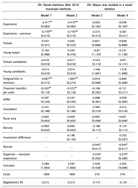 Next, I control for the relationship between politics at national and local levels. The most important political party in Peru of the 20th and 21st centuries is APRA (Partido Aprista Peruano); President Alan García’s party and where his term ended in 2011. The second-order election theory, explored especially in the European Parliament elections, posits that voters often try to punish the ruling parties in non-national elections (Oppenhuis, Van der Eijk, & Franklin, 1996). The greatest number of mayors came from APRA. I control this potential effect on the likelihood of a recall, and I use control variables for gender and age. In this respect, men are still perceived by a part of the population as better political leaders than women. However, according to the World Values Survey, in Peru, 30.3 percent of people strongly disagreed with this claim in 2012; 44.8 percent disagreed, and 18.9 percent either strongly agreed or agreed (Inglehart et al, 2014).