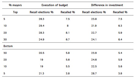 The third hypothesis is therefore refuted because after municipal elections in 2010, the likelihood of removal in initiated recall elections for poorly performing mayors was not greater. Unfortunately, it is not possible to examine this finding for previous years due to insufficient data. These conclusions confirm what other researchers have suggested in previous literature (Tuesta Soldevilla, 2014; Welp, 2016). Overall, findings in relation to recall elections in Peru are not what would be expected according to classical economic theory, in which voters reward the incumbents in good economic times and punish them in bad times (Lewis-Beck & Stegmaier, 2008). In Brazilian municipalities, Sakurai and Menezes-Filho (2008) find that spending money is directly related to a mayor’s future success and is therefore seen as a form of accountability. However, the worst performing Peruvian mayors are not punished any more than the better performing ones. Thus, in the case of Peru, these findings are an important contribution to the literature.