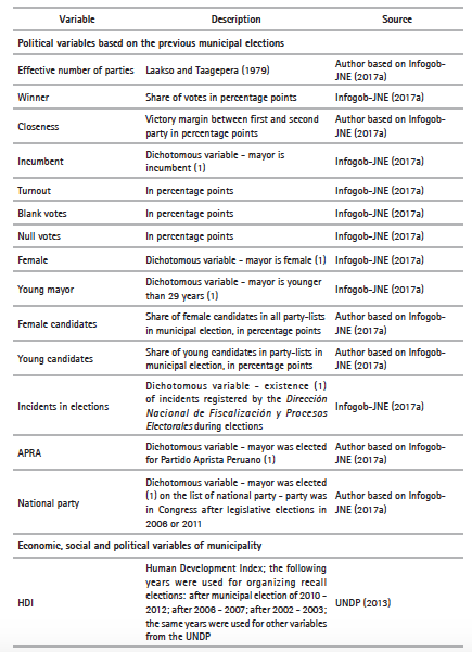 I use turnout as an additional variable to control the possible effects of political participation. Spivak (2004) finds that turnout is an important factor for the likelihood of recall elections in some states in the United States, as the required percentage of signatures to initiate recall elections in some states depends on the turnout in previous elections. Therefore, when abstention in the previous elections is high then it is easier for organizers to collect the required number of signatures as the number is low. However, voting in Peru is compulsory, and the required number of signatures is fixed at 25% of the electorate. Thus, turnout should be a less important variable for the likelihood of recall in Peru than in some states in the United States. I include the size of the municipality, density, and urbanization to control for the potentially easier organization of the recall in smaller areas and in high-density ones.