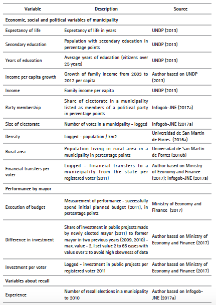 In the case of recall elections, citizens vote for each politician separately. However, I only examine a mayor in the second analysis because it is the most important office in the municipality. Recall elections held in 1146 municipalities until the year 2013 involved 1113 mayors (Infogob-JNE,2017). During recalls, voters can make decisions regarding multiple politicians in the same recall; however, I do not examine the 4083 councilors. Current research shows that councilors face recalls mainly because the opposition attempts to initiate new municipal elections6 (Tuesta Soldevilla, 2014, pp. 25–27). Thus, it is not really their performance that is involved and the model would be much more complicated to interpret because it would also be necessary to distinguish possible councilors who do not come from the mayor’s party.