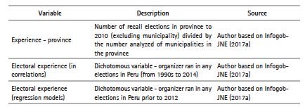 The last independent variable involves the recall organizer. I code a person with electoral experience as 1, if they ran in an election. This includes elections prior to 20128 at local, regional, and national levels. Information about recall organizers is provided by the National Jury of Elections (Jurado Nacional de Elecciones, JNE).