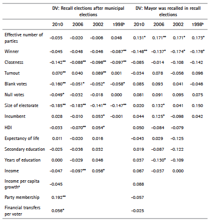 Four logistic regression models include as many variables as possible and examine the period after the municipal elections in 2010. I include all variables in correlations that were at my disposal from municipal elections since 1998 in the Appendix as a way of controlling logistic regressions that examine the recall only after 2010. In the rare11 case that municipal elections were annulled, I do not examine that municipality in the study period. I explain all variables and provide information on their source in Table4 of the Appendix.