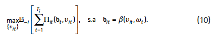 Para resolver la primera etapa del juego, se define V como el espacio de cantidades contratadas, B como el espacio de ofertas y Ω como el espacio de estados de naturaleza. Además, se define el vector de estrategias óptimas de la firma i el día de subasta t como el vector de funciones β: V x Ω -> B., tal que, para cada vit ∈ V y wt∈ Ω, it ∈ B., satisface las condiciones establecidas por la ecuación (9). Asimismo, Ti es el tiempo que dura un contrato para la firma i, el cual se asume como dado. El problema de optimización de la firma, en la primera etapa, se presenta en la ecuación (10):