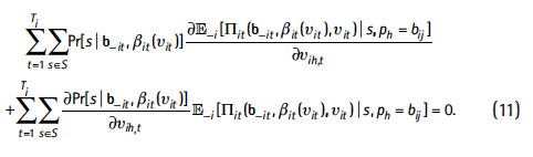 La ecuación (9) representa la definición habitual en la literatura de la oferta óptima en una configuración tradicional de subasta de precio uniforme (Hortacsu y Puller, 2008; Vickrey, 1961). Estas estrategias definen un equilibrio bayesiano perfecto en subjuegos para la segunda etapa que, por simplicidad, se restringe solo a estrategias simétricas.