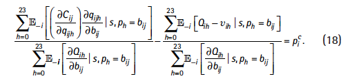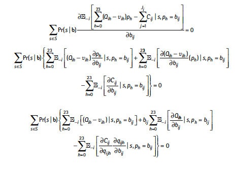 Dado que los cambios marginales de los precios ofertados por las firmas afectan los resultados del mercado solo cuando su unidad establece el precio spot con una probabilidad positiva, la derivada de los beneficios esperados de la firma con respecto a los precios ofertados debe estar condicionada por ph = bij. Igualmente, se asume que la planta j de la firma i es despachada. Por otro lado, teniendo en cuenta que