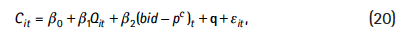 (20)donde C es el logaritmo de la posición neta (ventas menos compras) en contratos de la firma i en el día t; Q es el logaritmo de la generación ideal de la firma i en el día t; bid - pc es la diferencia entre el logaritmo del precio ofertado promedio de las unidades marginales y el logaritmo del precio promedio de los contratos en el día t; θ es un vector de efectos fijos de año, mes y firma; y ε es un término estocástico de perturbación.