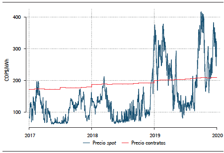 El precio spot presentó un notable incremento en sus valores medios durante el año 2019. Esto se debe a que los años 2017 y 2018 fueron años con una hidrología relativamente alta. En cambio, en el año 2019, el nivel de los ríos comenzó a reducirse, con lo cual los precios spot formados tendieron a incrementarse, pasando de niveles medios de 110 COP/kWh a niveles medios de 230 COP/kWh.