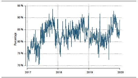 La Figura 2 presenta la participación de las cantidades totales contratadas diarias con las firmas generadoras como porcentaje de la demanda total entre los años 2017 y 2019. Puede observarse que las cantidades contratadas tienden a variar entre el 70% y el 90%. Además, la participación de contratos tiende a ser más alta durante los últimos meses del año que durante los primeros.