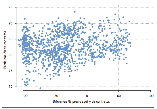 Inicialmente, mostraremos algunas estadísticas descriptivas asociadas a las variables de interés de esta investigación. En la Figura 3, presentamos un mapa de dispersión entre, por una parte, la participación de la electricidad vendida en contratos en la demanda total del día y, por otra, la diferencia porcentual entre el precio spot y el precio promedio de los contratos.