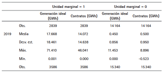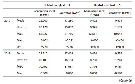 En el Cuadro1, presentamos estadísticas descriptivas por año de la generación ideal y de la posición neta en contratos de las firmas (ambas en GWh), para los momentos cuando las firmas tienen unidades marginales y cuando no las tienen.