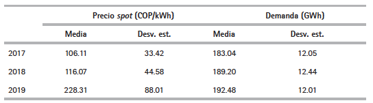 Además, la variabilidad del precio spot, medida a través de la desviación estándar de la serie, también tendió a incrementarse con el paso del tiempo. El precio spot pasó de tener una desviación estándar de 33 COP/kWh, en 2017, a una de 88 COP/kWh, en 2019. Por otro lado, la demanda promedio diaria pasó de tomar valores medios de 183 GWh, en 2017, a tomar valores medios de 192 GWh, en 2019, sin presentar cambios notables en su variabilidad.