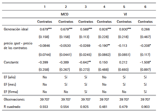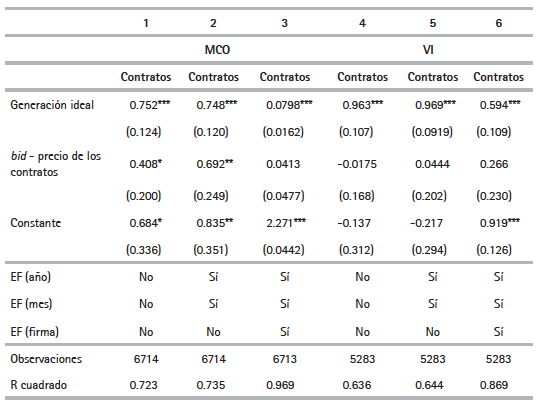 Nuestros resultados muestran que existe evidencia a favor de esta predicción teórica. Las firmas con unidades marginales tienden a fijar su posición en contratos en función de la generación ideal. Sin embargo, no encontramos una relación significativa con la diferencia entre costos marginales y precios de los contratos.
