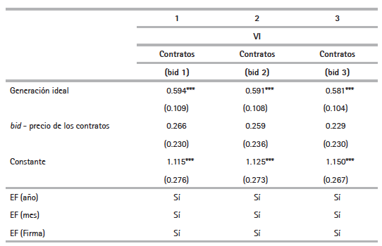 En cuanto a la diferencia entre precios ofertados de unidades marginales y precio de contratos, la evidencia de una relación positiva pierde significancia conforme se añaden efectos fijos. Cuando corregimos el potencial problema de endogeneidad, instrumentando la generación ideal con la demanda y los precios ofertados con precios de combustibles y caudales de los ríos, los resultados son más favorables a nuestras predicciones teóricas. Cuando se incluyen efectos fijos de año y mes, el coeficiente estimado de la generación ideal es positivo y cercano a uno. Pero, cuando se añaden efectos fijos de firma, la relación entre contratos y generación ideal es positiva, con una magnitud de 0.594. Con relación a la diferencia entre precios ofertados de unidades marginales y precio de contratos, el signo es positivo, pero no significativo. Estos resultados constituyen evidencia a favor de nuestras predicciones teóricas asociadas a la ecuación (19).