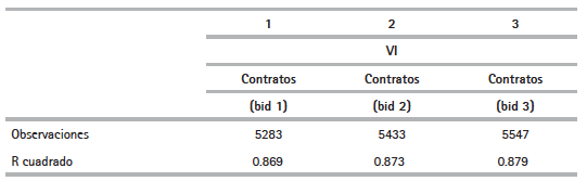 Los resultados del Cuadro 4 muestran que la generación ideal tiene un efecto positivo y significativo sobre el nivel de los contratos. Esta evidencia se encuentra cuando utilizamos MCO, y es robusta ante la inclusión de efectos fijos. Sin embargo, cuando utilizamos VI, la evidencia es menos clara. La cantidad de contratos tiene una relación positiva con la generación ideal, cuando se incluyen efectos fijos de año y mes, pero esta relación deja de ser significativa cuando se incluyen efectos fijos de firma.