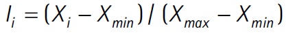 Con el tratamiento realizado a los datos, el siguiente paso consta de ejecutar el proceso de estandarización de las variables, ya que se encuentran expresadas en unidades de medida que son distintas unas de otras. Para este caso se usó el método de escalamiento lineal empleado por Vega-Ojeda y Bravo-Benavides (2015) para la creación de un índice ambiental que permitió obtener valores reescaldos de 0 a 1. Actis di Pasquale y Balsa (2017) mencionan que esta técnica hace uso de valores máximos y mínimos de cada una de las variables y su resultado se consigue como la diferencia entre el indicador Xiy su valor mínimo Xmin, dividido para la resta entre el dato máximo y el dato mínimo (Xmax - Xmin). Lo cual se enuncia en los siguientes términos: