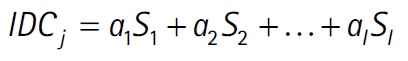 Finalmente, el índice para cada cantón denotado como IDC j (j = 1,2,3,...,221) se compone de la suma de los subíndices calculados, multiplicados por su respectivo ponderador, lo cual se expresa de la siguiente forma: