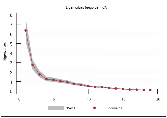 A partir de esto se selecciona el número de componentes, en este caso se opta por considerar los valores propios λj . De esta manera, bajo el criterio de Kaiser se conservan aquellos que sean mayores a uno (Poza, 2008). Adicionalmente, se refuerza esta selección considerando intervalos de confianza con el fin de retener aquellos que poseen significancia estadística.