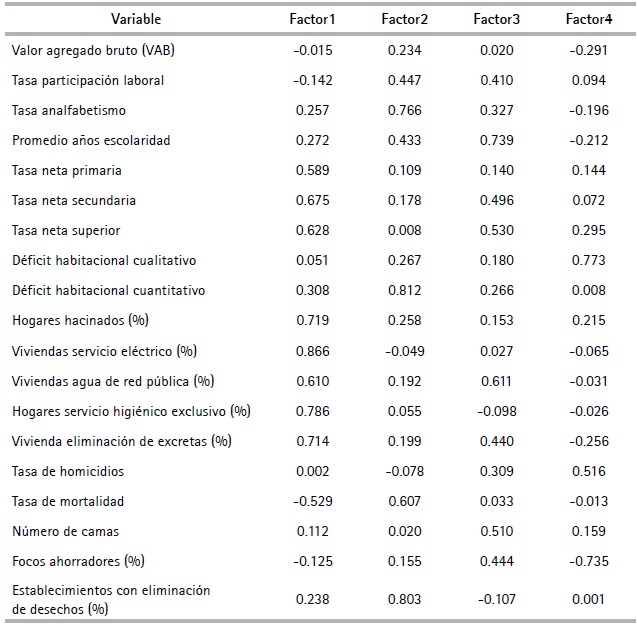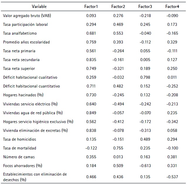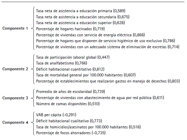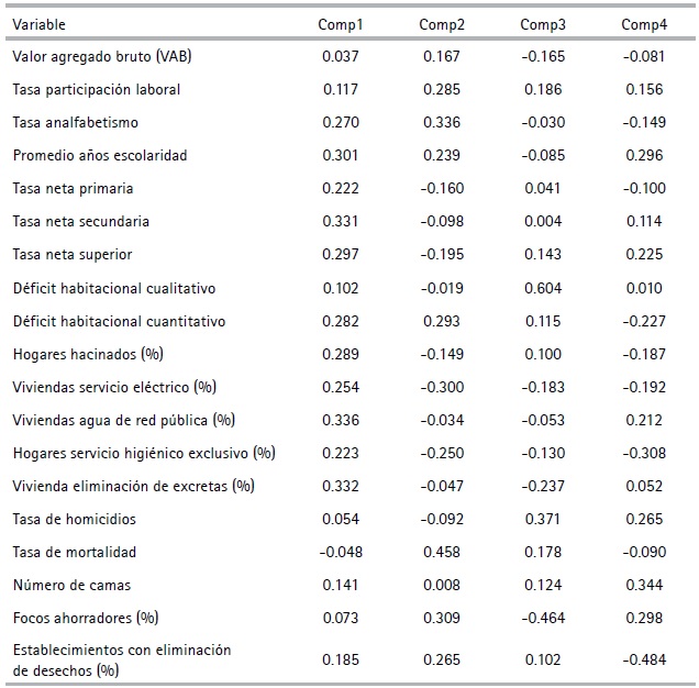 El aporte de cada componente principal disminuye conforme desciende su ubicación, resaltando que los cuatro primeros son más significativos que el resto, dado que sus intervalos se ubicaron por encima de la unidad y, por tanto, poseen mayor representatividad (Figura 1). Por esta razón, en este artículo se prefirió trabajar únicamente con estos, cuya variabilidad conjunta corresponde al 63.5 %. A partir de lo expuesto, el Cuadro 2 muestra la matriz de los cuatro componentes que se seleccionaron.