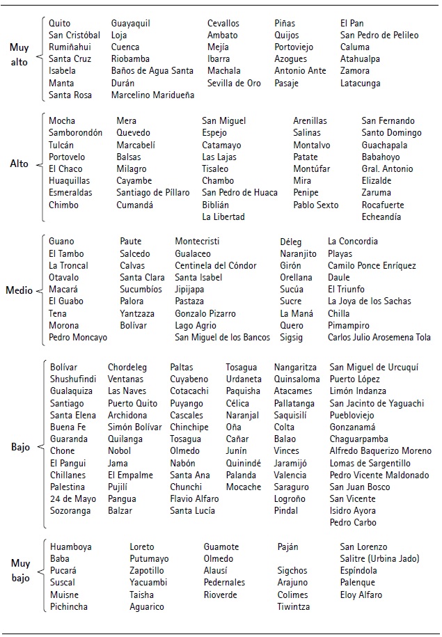 Por tanto, el índice propuesto ha reforzado el análisis que busca plasmar la situación de desarrollo en la que se encuentran los cantones en Ecuador, a fin de incorporar elementos adicionales que alimentan este tipo de estudios. Es necesario destacar que la disponibilidad de información jugó un papel muy importante, en este caso fue factible acceder a estadísticas del 2010 (dada la cantidad de información contenida), aunque ciertos indicadores usados poseen información de años recientes. El impedimento es que la mayoría de los datos provinieron, en gran parte, de los censos que se ejecutan cada cierto tiempo, limitando la obtención de datos actuales a nivel cantonal con respecto a las otras variables. Por esta razón, sería trascendental ejecutar este tipo de estudios en años posteriores, cuando las instituciones del país pongan a disposición información actualizada, ya que resultaría importante reconocer si desde el 2010 los niveles de desarrollo de estos territorios han mejorado.