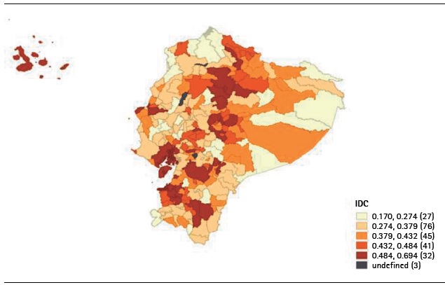 Los cantones con los mejores niveles de IDC presentaron mejores condiciones, esencialmente en categorías de educación, vivienda, salud, empleo, saneamiento, servicios básicos, ahorro de energía y manejo de desechos. Por otro lado, los cantones con los niveles más bajos de IDC se vieron perjudicados en estas categorías mencionadas, sumada la deficiencia en la categoría de seguridad. De esta forma, se evidencia la brecha existente entre estos aspectos característicos del desarrollo local que beneficiaron a unos territorios y perjudicaron a otros.