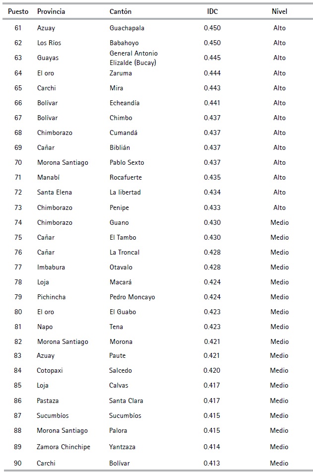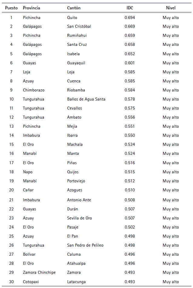 Los cantones que obtuvieron los IDC más altos fueron Quito, catapultado con el mejor índice dentro del ranquin, además de San Cristóbal, Rumiñahui, Santa Cruz e Isabela, todos con un nivel de desarrollo muy alto. En este mismo estrato se destacaron dos cantones más que fueron Guayaquil y Cuenca, territorios que además de Quito concentran las tres ciudades más grandes del Ecuador. Por el contario, los cantones que evidenciaron mayores deficiencias fueron Taisha, Rioverde, Tiwintza, Eloy Alfaro, Pichincha y Aguarico.