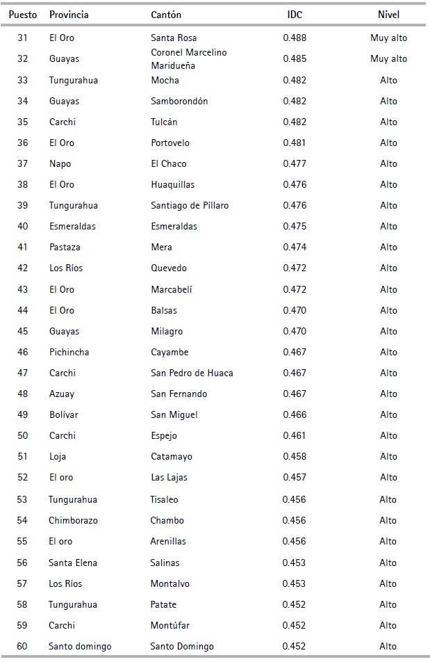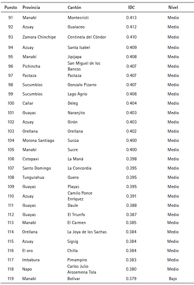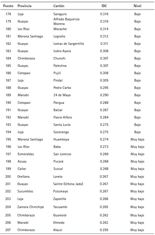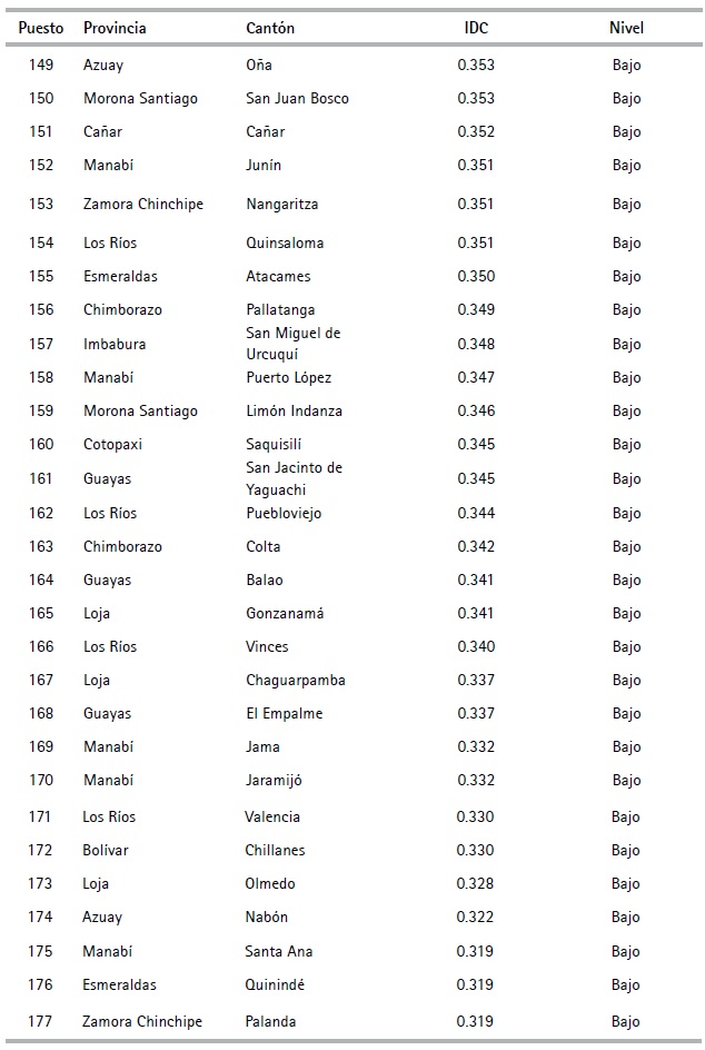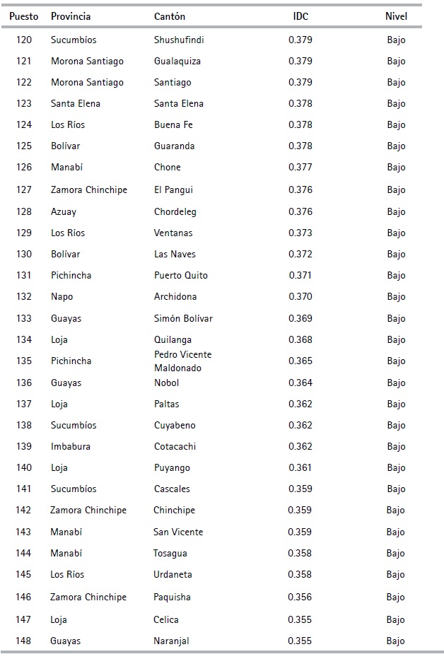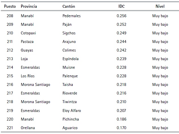 Por otra parte, un escenario adverso al expuesto se evidenció en los cantones que se ubicaron en las últimas posiciones del IDC, enfatizándose mayores deficiencias en estos. Los resultados muestran que entre los últimos lugares del IDC, caracterizados por un nivel de desarrollo más bajo, se encontró un grupo de cantones mayormente perteneciente a la Costa y a la Amazonía.