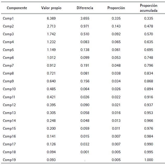 Posteriormente, se obtuvo el Cuadro 1. Este muestra en total los 19 componentes principales con sus respectivos valores propios que corresponden a la varianza asociada a cada componente, así como la proporción explicada por cada uno de ellos.