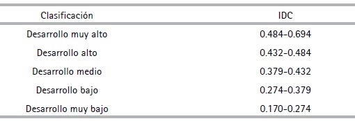 Para una clasificación idónea de los resultados obtenidos en el IDC se ejecutó la ordenación de los valores aplicando el método de Dalenius y Hodges (1959). Esta categorización se expresa en el Cuadro 3.