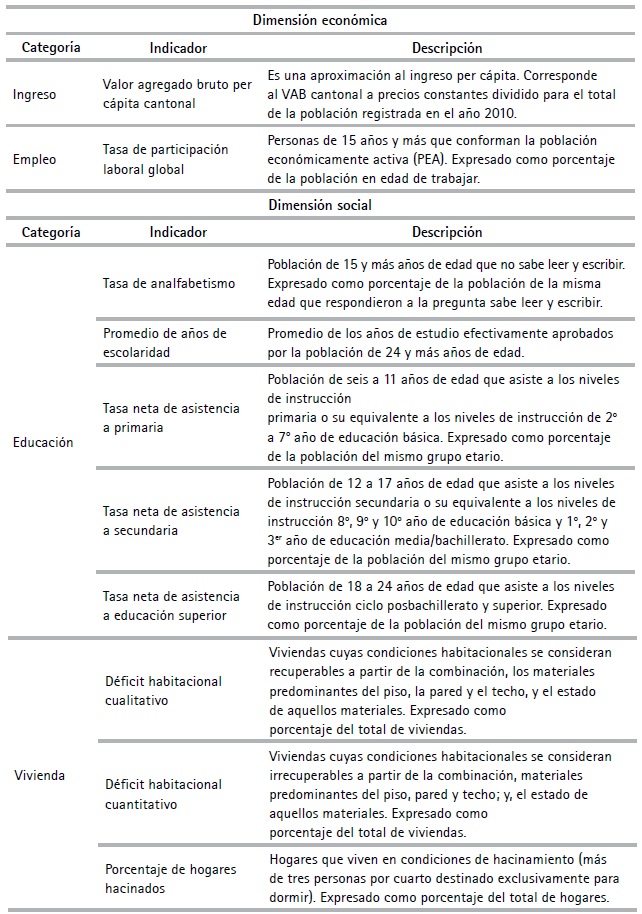 Con miras a la construcción del índice de desarrollo cantonal en Ecuador, se inicia con la identificación de los datos correspondientes a los indicadores de las dimensiones económica, social y ambiental, para los 221 cantones del Ecuador, tomando como año de referencia el 2010, debido a la cantidad de datos en ese año, puesto que se cuenta con información de los principales censos a nivel cantonal, información que no está disponible en años posteriores a ese nivel de desagregación. Las fuentes de las que se obtienen estos datos son el Instituto Nacional de Estadísticas y Censos (INEC), de los cuales se utiliza el Censo de Población y Vivienda 2010, el Censo Económico 2010, las Estadísticas Vitales-Defunciones 2010 y las Estadísticas Hospitalarias de Camas y Egresos 2010. La segunda fuente de datos es el Banco Central del Ecuador (BCE), de la cual se emplea las cuentas regionales 2010. Como tercera fuente se tiene al Ministerio del Interior (MI), en conjunto con la Policía Nacional del Ecuador (PNE).