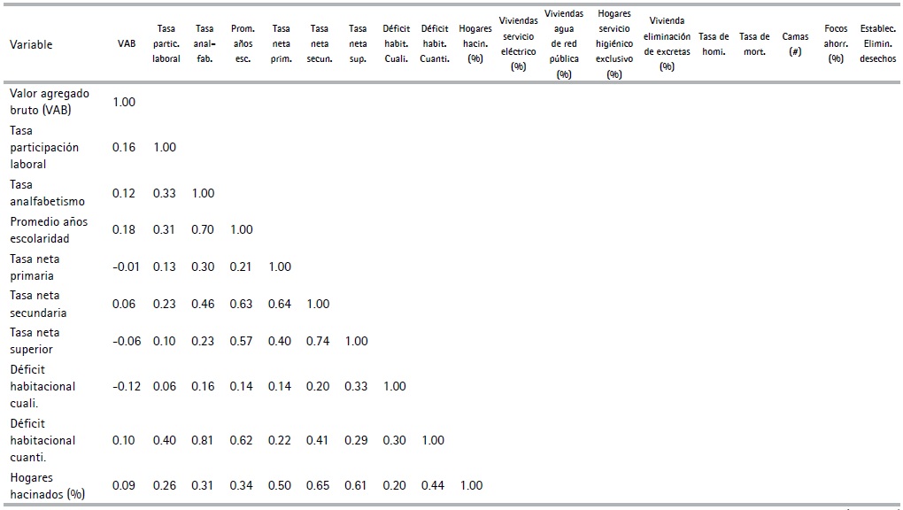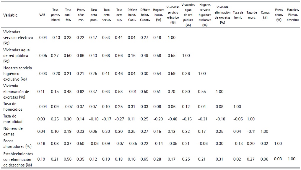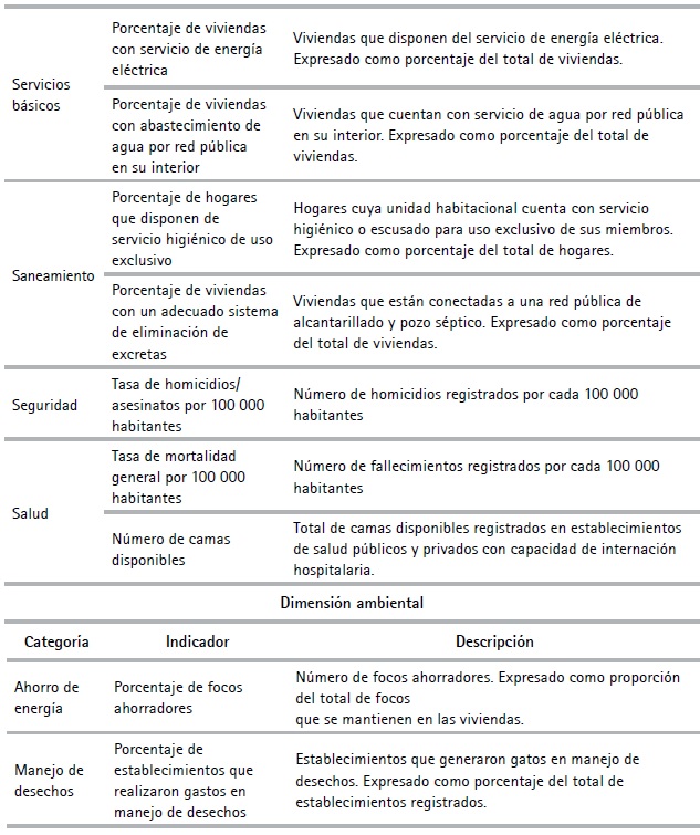 De estas fuentes de datos se obtiene un total de 19 indicadores divididos en categorías de ingreso, empleo, educación, vivienda, servicios básicos, saneamiento, salud, seguridad, ahorro de energía y manejo de desechos. Estas categorías, a su vez, se agrupan en las dimensiones económica, social y ambiental. Las variables seleccionadas se detallan en el Anexo 1 y sirven de base para llevar a cabo la técnica del análisis de componentes principales (ACP) que forma parte del método estadístico multivariante. El ACP propuesto por Karl Pearson y Hotelling parte de un conglomerado de variables p, a partir del cual se genera una transformación lineal con el fin de obtener un conjunto de nuevas variables q que se convierten en los componentes principales, y se logra así reducir la dimensionalidad del grupo original de los datos (Ruiz, 2018).