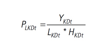 Para mostrar esta relación se calcula la productividad laboral por medio de la Ecuación (1); donde PLKDt es la productividad laboral en el sector K en el departamento D durante el periodo t; YKDt el valor agregado de la economía en el sector K en el departamento D durante el periodo t, LKDt el número de trabajadores en el sector K en el departamento D durante el periodo t y HKDt el promedio de horas trabajadas en el año en el sector K en el departamento D durante el periodo t.
