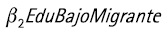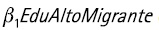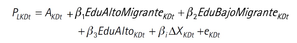 (4)Para nuestro estudio es de suma importancia evaluar los coeficientes β1 y β2 que demuestran las diferencias en los niveles de productividad (calculada como horas trabajadas por trabajador) de los migrantes de acuerdo con su nivel educativo en contraste con la población base (no migrantes venezolanos con nivel educativo bajo). A su vez, es importante evaluar la diferencia β3 - β1, la cual prueba la diferencia en los niveles de productividad de los migrantes de nivel educativo alto con respecto a los no migrantes del mismo nivel educativo.