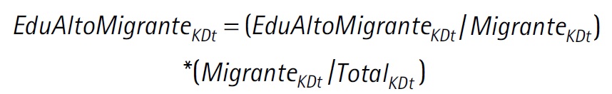 (2)En la Ecuación (2)EduAlto representa la fracción de personas ocupadas no migrantes en el sector K en el departamento D durante el periodo t que están en el nivel educativo alto. Los niveles son: (i) bajo (media, básica secundaria, básica primaria o menos –excluido de la regresión para tomarlo como base–), (ii) alto (técnico, tecnólogo o profesional); X representa la matriz de las variables de control (grupo etario y proporción de mujeres); AKDtes un vector de efectos fijos para cada uno de los sectores en cada uno de los departamentos para cada año; y EduBajoMigrante y EduAltoMigrante representan la fracción de población migrante venezolana por cada nivel educativo del total de la población ocupada en el sector K en el departamento D durante el periodo t. Definidas de la manera como se muestra en las ecuaciones (3) y (4)14.