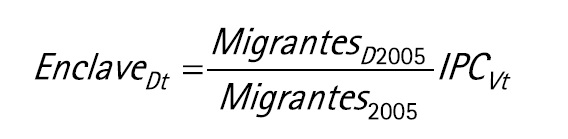El instrumento utilizado se basa en el instrumento de enclave de Card (2001), el cual ya ha sido aplicado a estudios de migración para el caso colombiano, como en el trabajo de Bonilla et al. (2020). Este explota la variación regional de las redes de migrantes y el momento e intensidad de la crisis económica venezolana. Así, la variable instrumental se construye a partir de la proporción de venezolanos que vivían en cada departamento en 200516 interactuada por el IPC venezolano en el periodo t, tal como se muestra en la Ecuación (5)17. Gracias a que las redes migratorias se formaron antes de la crisis (2005) y no hay razones para creer que la productividad colombiana tenga algún efecto sobre la crisis económica venezolana, medida por el IPC, el instrumento que se construyó es válido para estimar la migración y elimina el sesgo de autoselección.