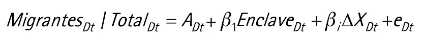 (5)Para el análisis de la variable instrumental se estiman regresiones en dos etapas, en la primera de estas se estima la proporción de migrantes en el departamento D para el periodo t usando el instrumento tal como se revela en la Ecuación (6). Luego, utilizando los valores predichos que arroja la Ecuación (6) se estima el modelo propuesto en la Ecuación (7). El modelo también incluye efectos fijos para cada departamento y tiempo, tal como las regresiones anteriores.