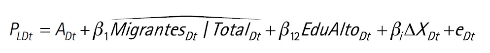 (7)Para nuestro estudio es necesario evaluar el coeficiente β1 de la Ecuación (7), puesto que este muestra el impacto de los migrantes en la productividad de cada departamento. En ese sentido, de acuerdo con lo establecido en la descripción de datos, se espera que este sea positivo, ya que la población migrante, por sus características, puede tener efectos positivos en la productividad laboral.