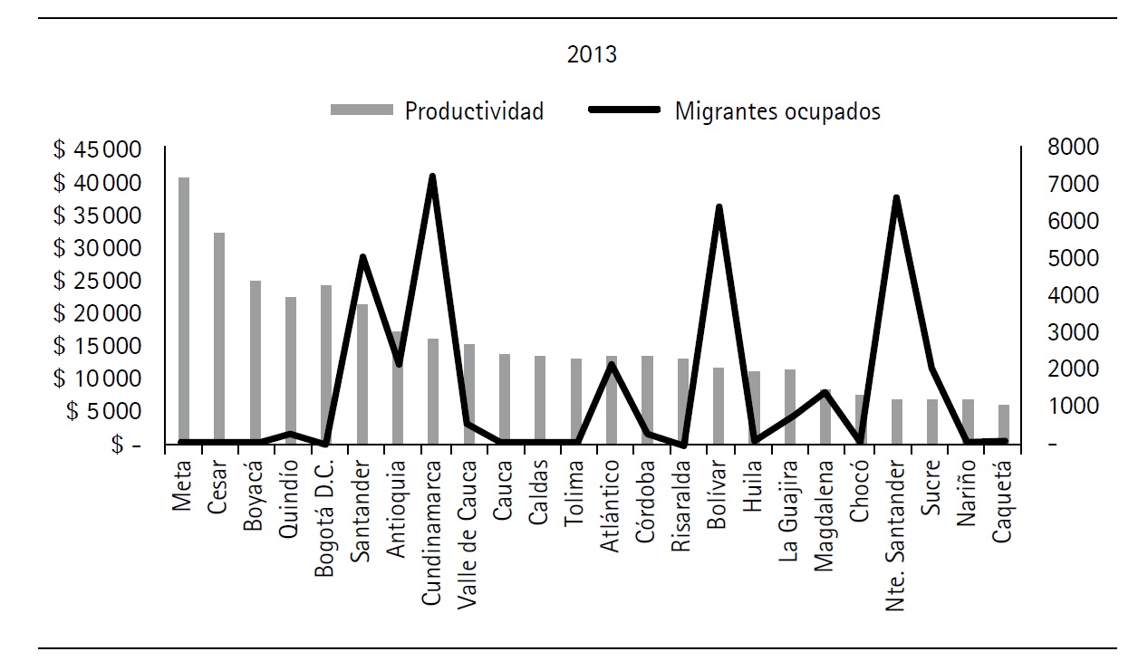 En cuanto a la distribución de la población migrante en los departamentos, teniendo en cuenta su productividad (véase Figura 1) en el primer año de observación (2013) la población venezolana llegó principalmente a los departamentos fronterizos, independientemente de que estos se consideren poco productivos en comparación con otros. Este es precisamente el caso de departamentos como Norte de Santander y La Guajira en vez de departamentos altamente productivos como Boyacá y Bogotá D. C.