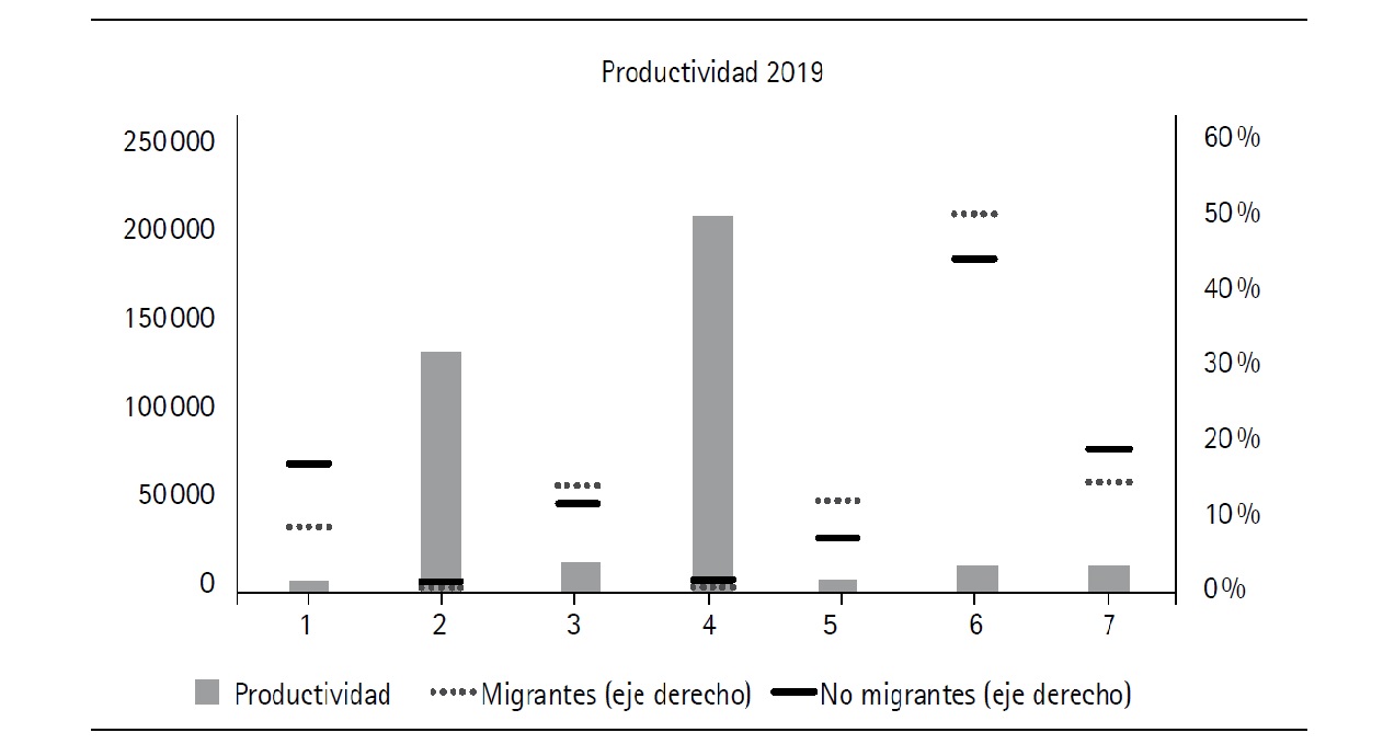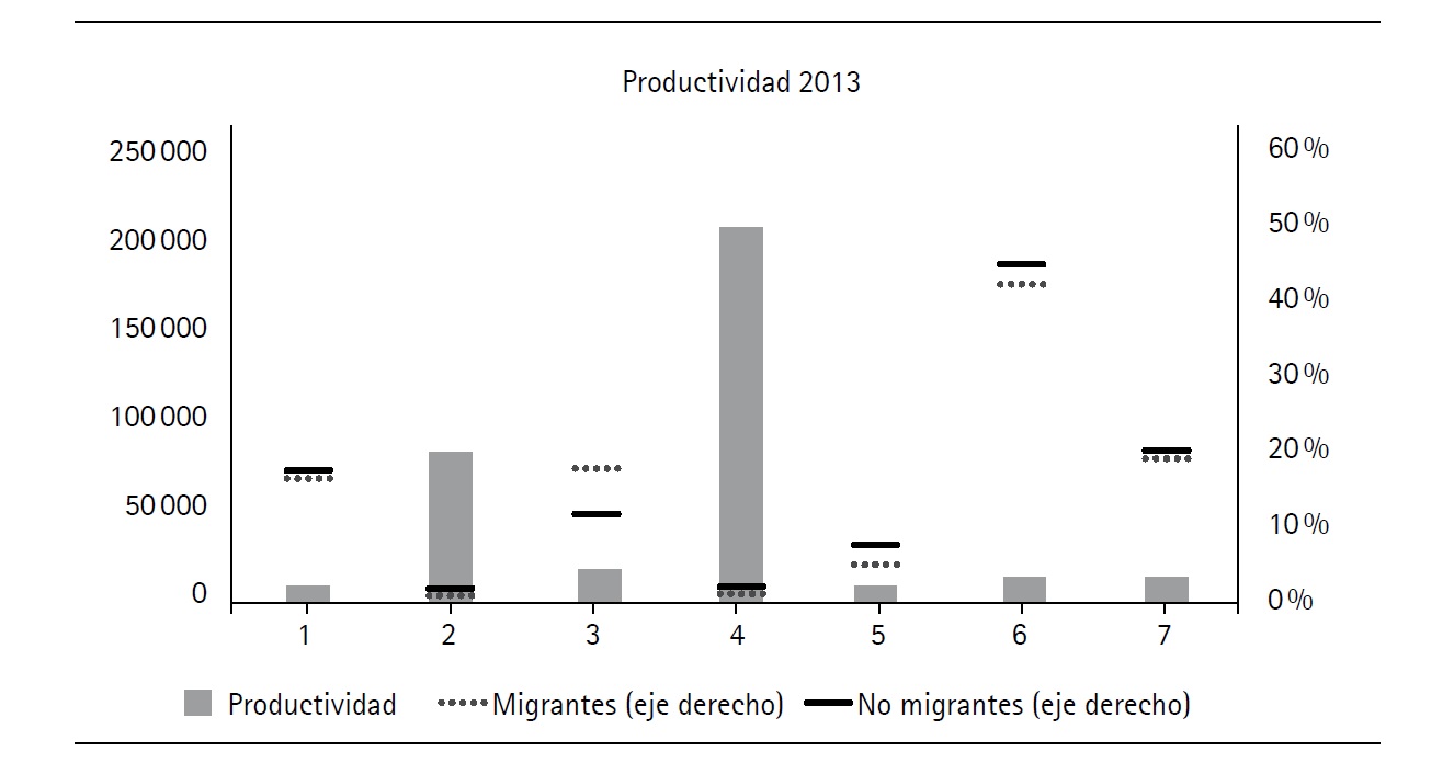 podría tener una baja o inclusive no significativa contribución en la productividad, dado que aunque podría llegar a generar un aporte positivo por su alta participación en el grupo 1 –(agricultura, ganadería, caza y silvicultura o pesca) caracterizado por tener una menor competencia laboral con la población no migrante– este efecto podría contrarrestarse debido a su mayor participación en el grupo 6 (Comercio, hoteles y restaurantes, transporte y almacenamiento, intermediación financiera, actividades inmobiliarias), en el que se presenta alta competencia con la población no migrante con nivel educativo bajo y migrante con nivel educativo alto.