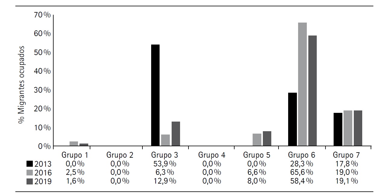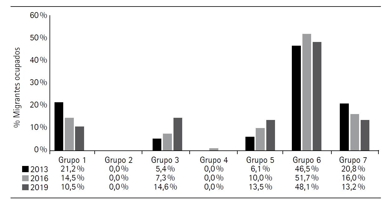 Para el final del periodo analizado, 2019, se advierte en la Figura 4 que no hay cambios significativos en la ubicación de la población migrante ocupada. Así como en el 2013, se encontró que la migración se concentró principalmente en el grupo 6. Para el 2019, vemos un aumento de menos del 10 % de participación migrante en este sector. Asimismo, observamos que hay un incremento en el porcentaje de participación en el grupo 5. Con todo, continúa la tendencia de una ubicación de los migrantes en sectores con baja productividad e intensivos en el uso de mano de obra.