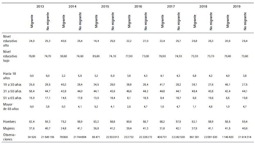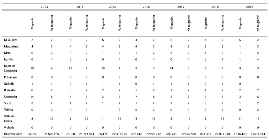 Para el periodo comprendido entre 2013 y 2019 se realizó una caracterización de la población ocupada, diferenciando por migrantes y no migrantes, para las variables nivel educativo, grupo etario y género (véase anexo A2). Después, se llevó a cabo una caracterización por departamentos (véase anexo A3) y sectores (véase anexo A4) con el fin de conocer cómo se ubican los migrantes e identificar las movilizaciones de capital humano venezolano entre sectores y departamentos. Por otra parte, a partir del análisis de los puntos anteriores, se buscó detectar si los migrantes se concentraron en los departamentos y sectores con mayor productividad laboral, lo cual indicaría que, al momento de medir los aportes de la migración sobre la productividad, debería considerarse un posible sesgo de endogeneidad por autoselección.