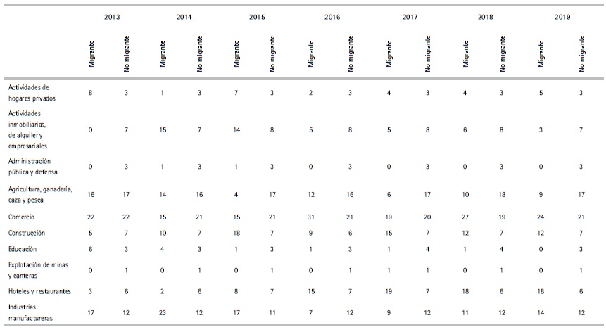 Para las Figuras 3 y 4 se introdujo el comparativo del porcentaje de ocupación de la población no migrante como referencia. Con este comparativo se obtienen tres conclusiones. La primera, que del 2013 al 2019 el porcentaje de población migrante en el grupo 6 (comercio, hoteles y restaurantes, transporte y almacenamiento, intermediación financiera, actividades inmobiliarias) superó al porcentaje de población no migrante; no obstante, vemos que en cualquier condición este sector concentra un alto porcentaje de contratación.