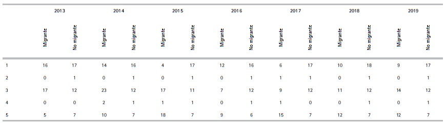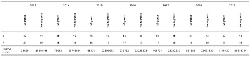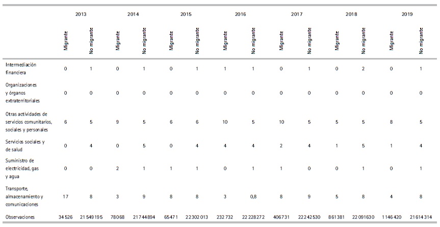La segunda, que la participación de población migrante se redujo casi a la mitad para el grupo 1 (agricultura, ganadería, caza y silvicultura o pesca) en este periodo de tiempo. La tercera, que el grupo 5 (construcción) amplió el porcentaje de contratación de población migrante en los últimos años, poniéndolos por encima de la población no migrante. Esto pudo ocurrir debido a que en este sector se presenta mayor informalidad y muchos de los migrantes no contaban con permisos especiales para trabajar.