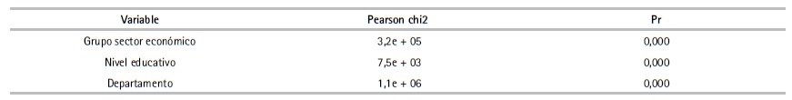 Por último, se efectuó la prueba de hipótesis χ² de Pearson para verificar la existencia de diferencias en la población migrante y no migrante con respecto a las variables nivel educativo, sector económico y departamento. De la aplicación de esta prueba se encontró que para un nivel de significancia del 5 % en todas las variables analizadas existe diferencia en las proporciones de migrantes y no migrantes (véase anexo A5).